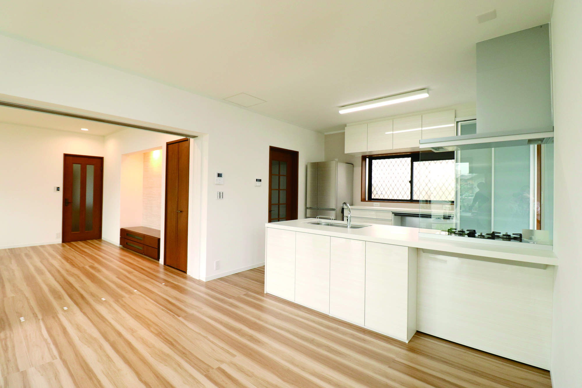 既存窓・建具はそのまま活かしながら、白を基調とした家族の集まるLDKにリフォーム。