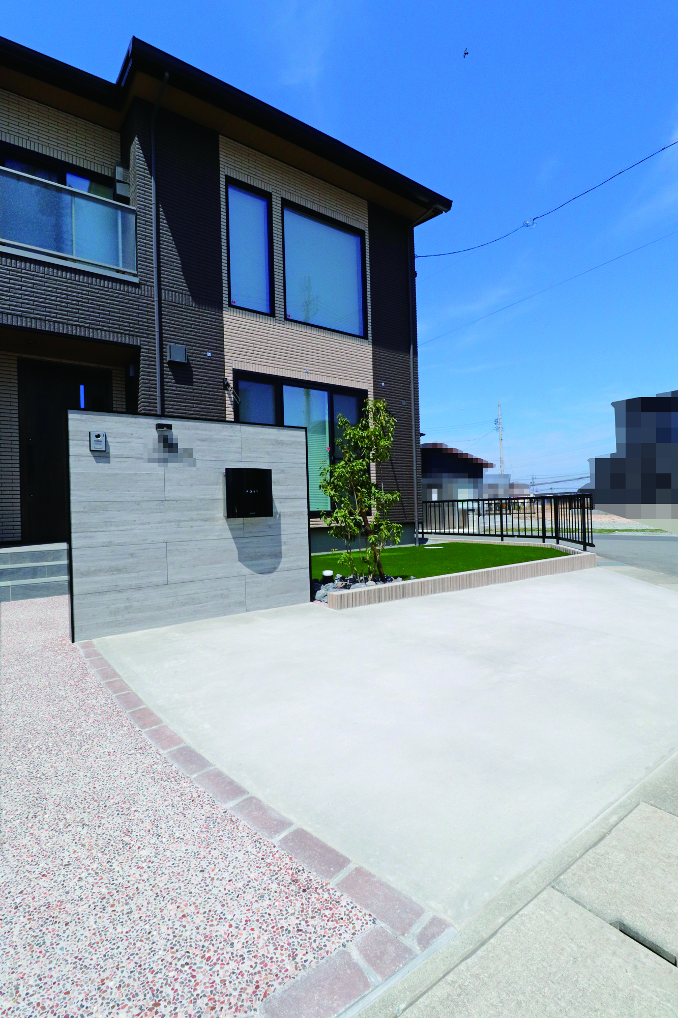 スタイリッシュなタイルで仕上げた門塀と、素材感のある洗い出しのアプローチのR曲線であたたかな空間に仕上がりました。