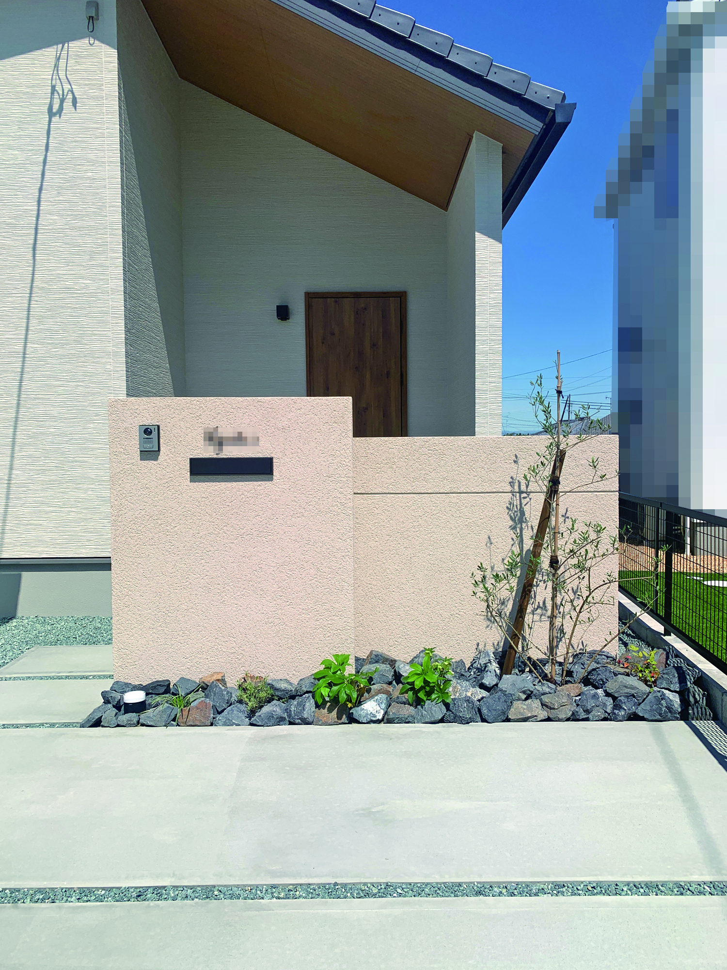 スタイリッシュな門塀を引き立てるオリーブの木とゴロタ石が優しくお迎えしてくれます。