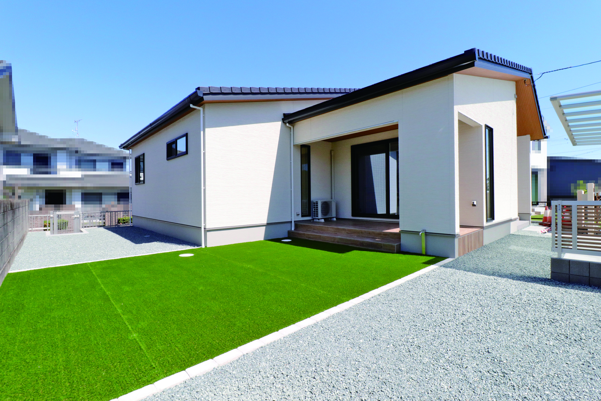 「ゆったりとしたお庭とタイルデッキのある新築外構」