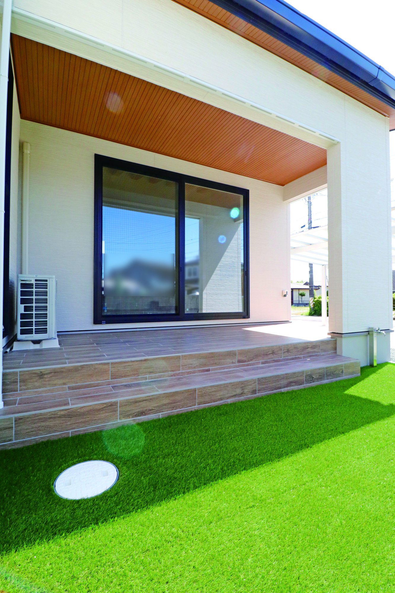 デザイン性のあるタイルデッキからは、広々とした人工芝のあるお庭でのんびり快適に。